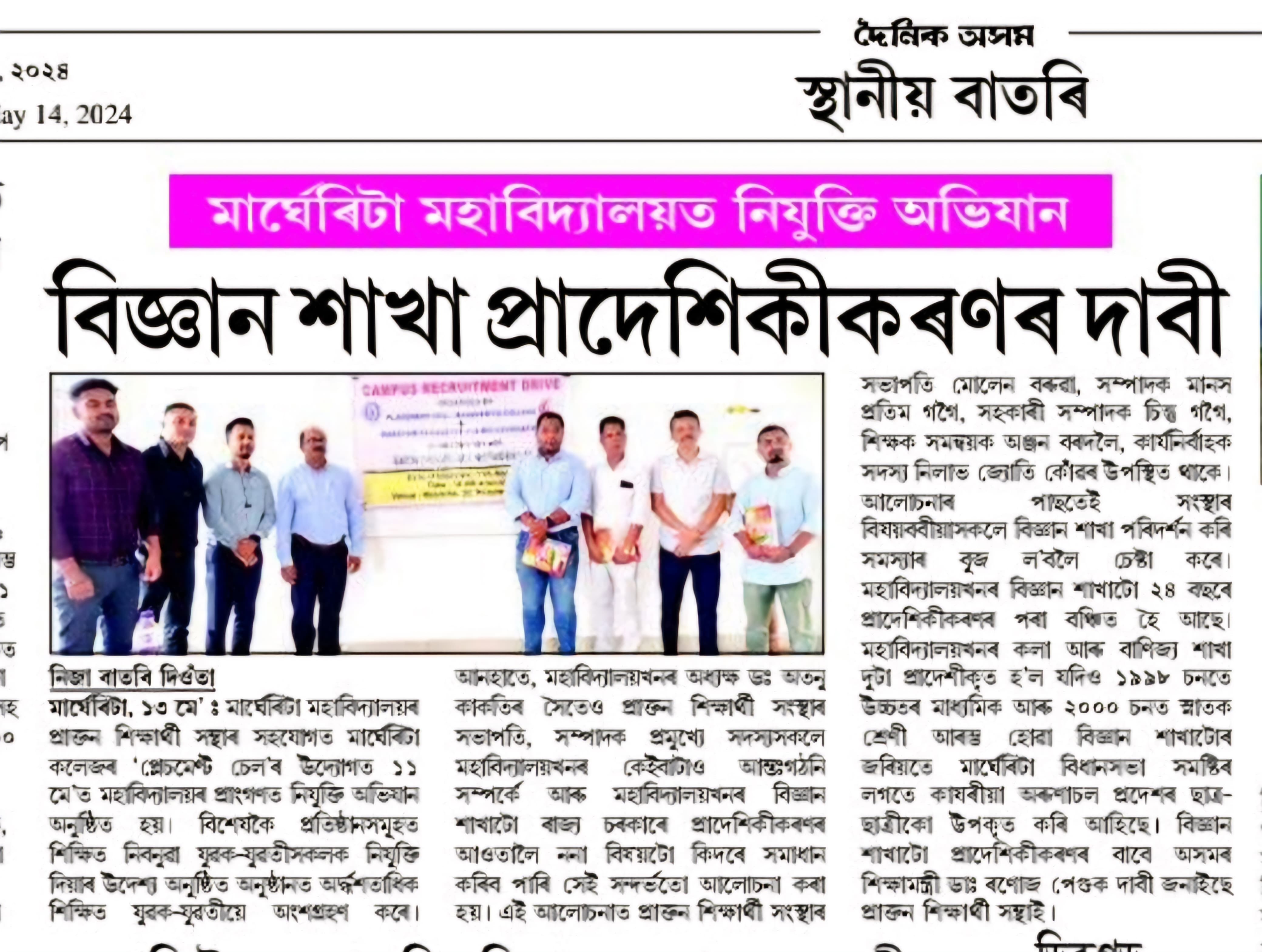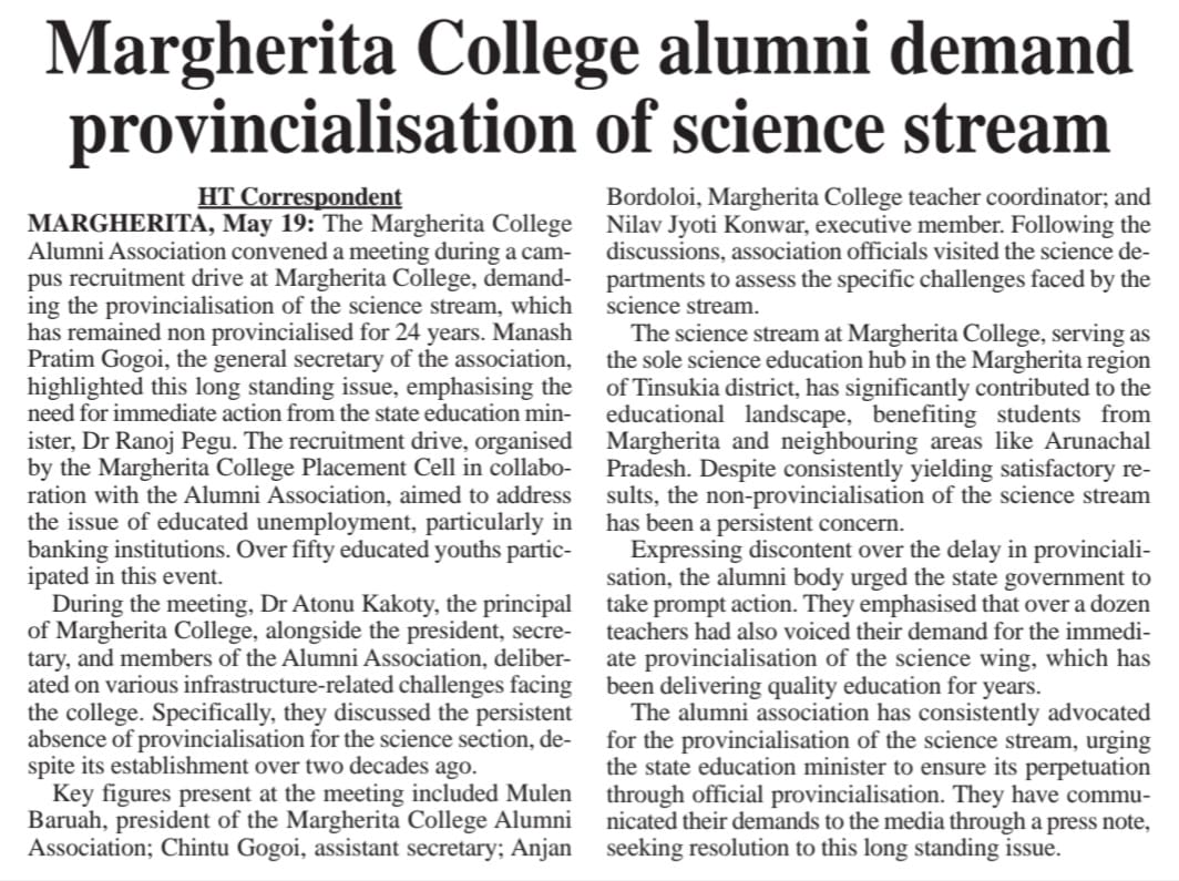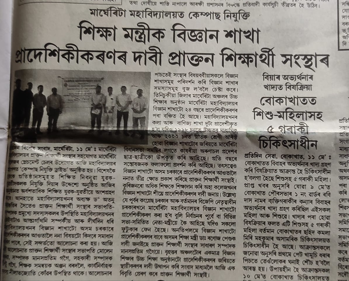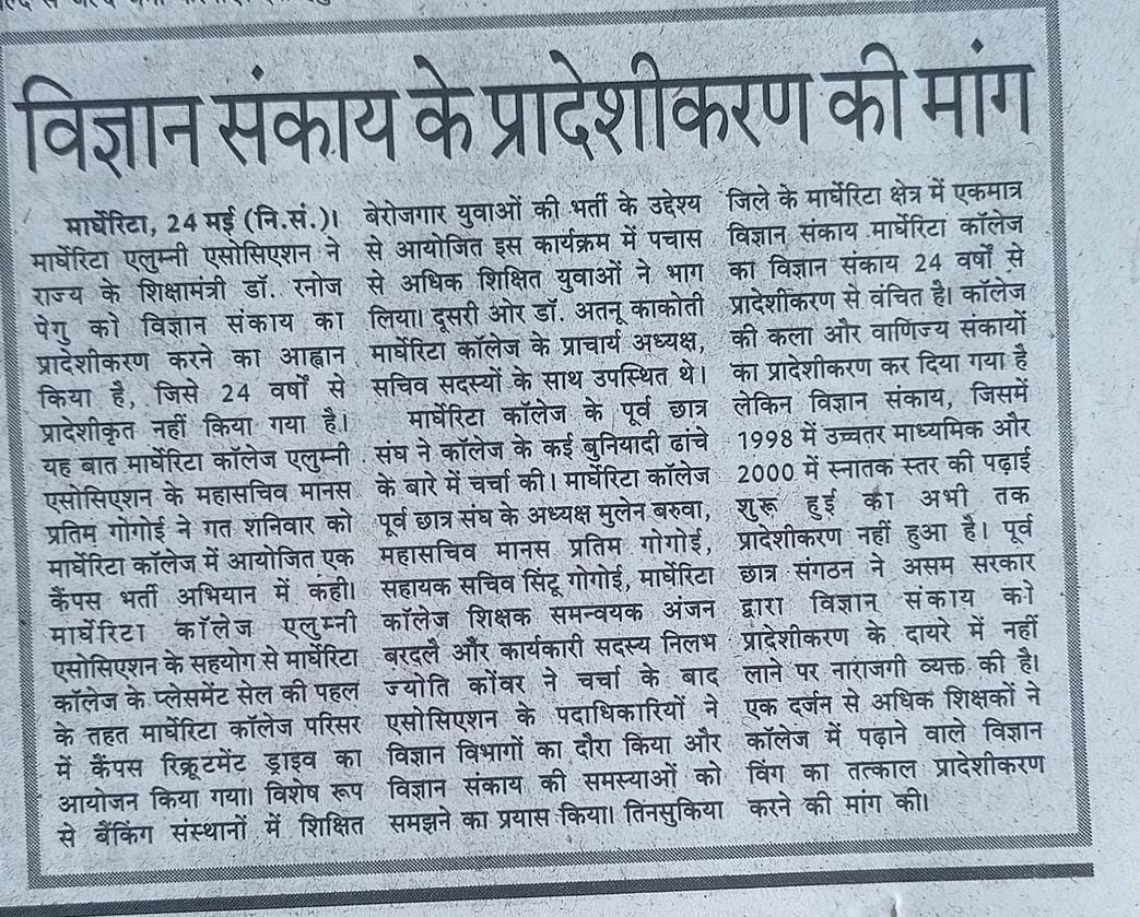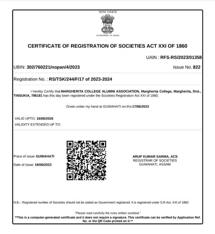 Margherita College Alumni Association (MCAA) have always cooperated in the activities (academic & non-academic) organized by the / held at the college since its formation. Many ex-students engaged in the college in different positions and those from outside have also cooperated in different ways whenever required.