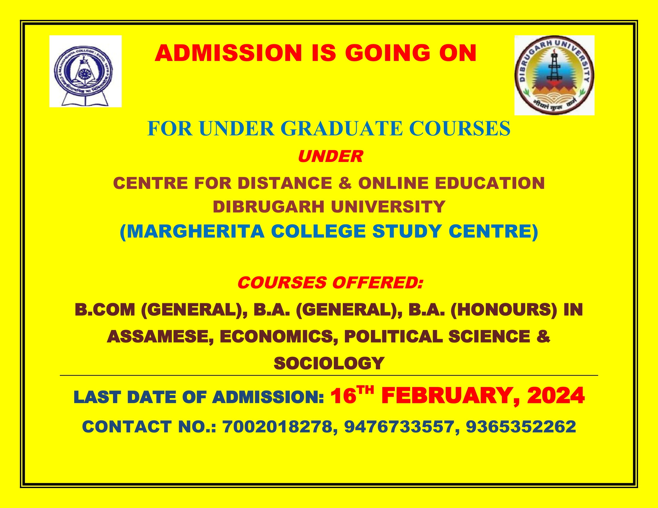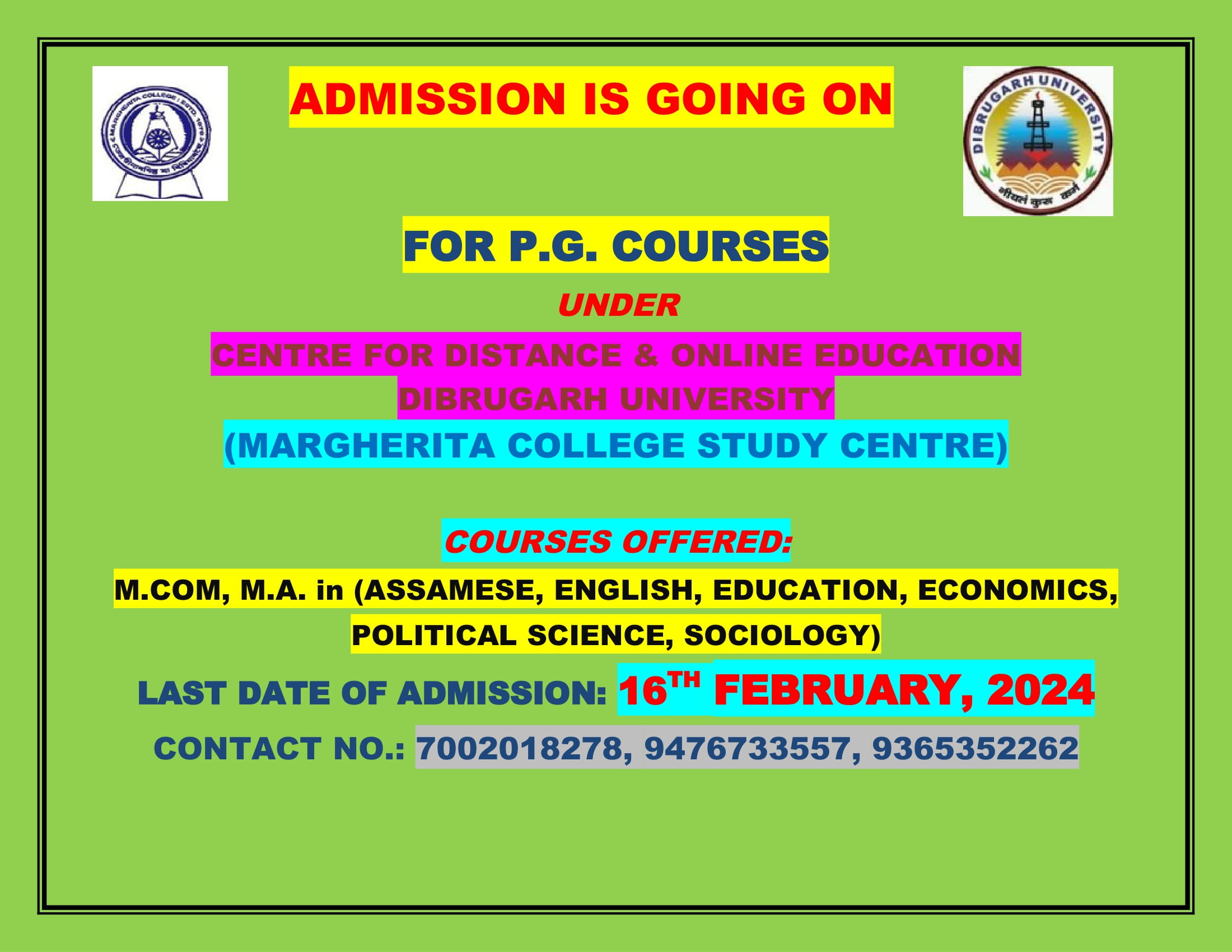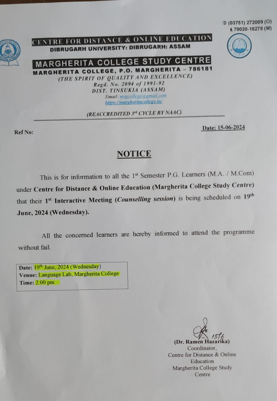 Interactive meeting (Counselling Session) for the 1st Semester P.G. Learners (M.A./ M.Com) under CDOE-DU, Margherita College Study Centre will be held on 19th June, 2024 (Wednesday). View 2024-06-15